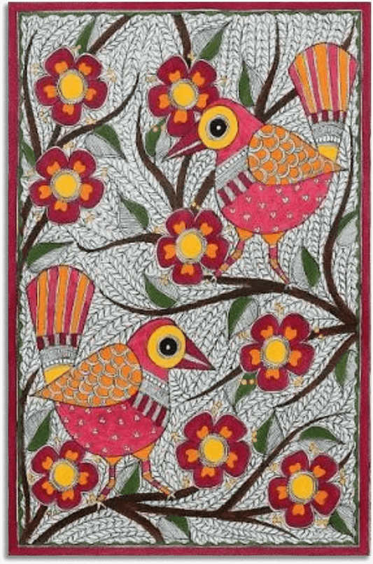ORIGINAL HANDMADE BIRDS WITH FLOWERS MADHUBANI PAINTING